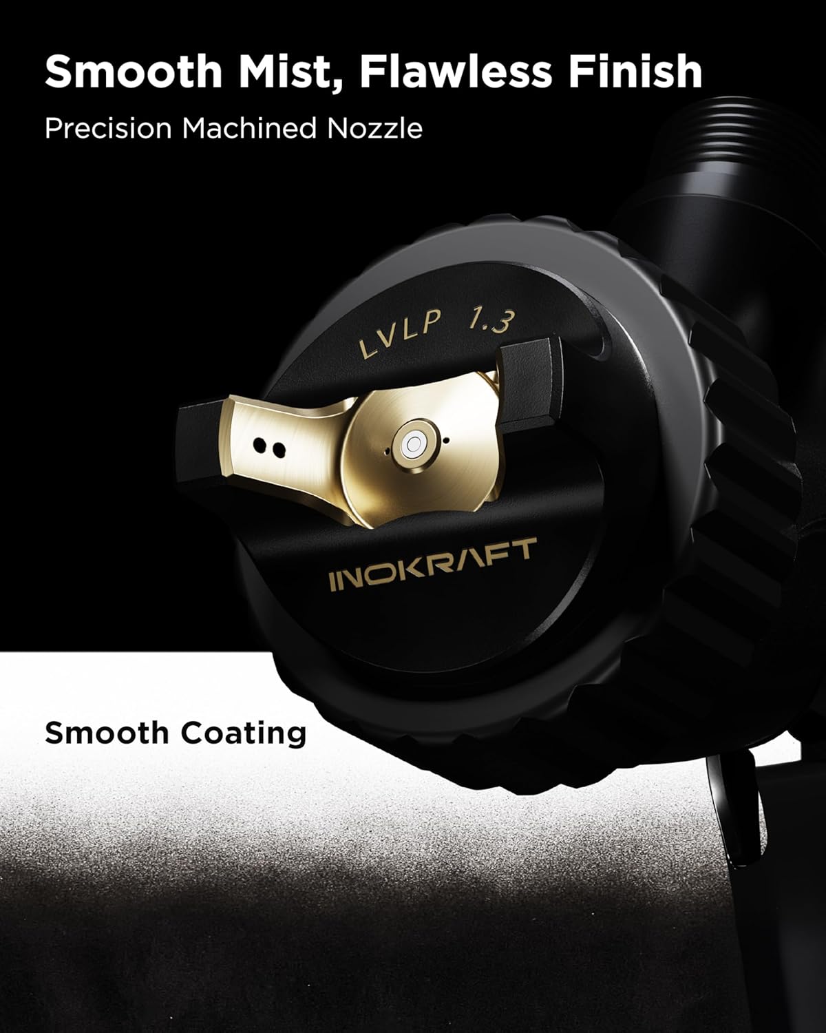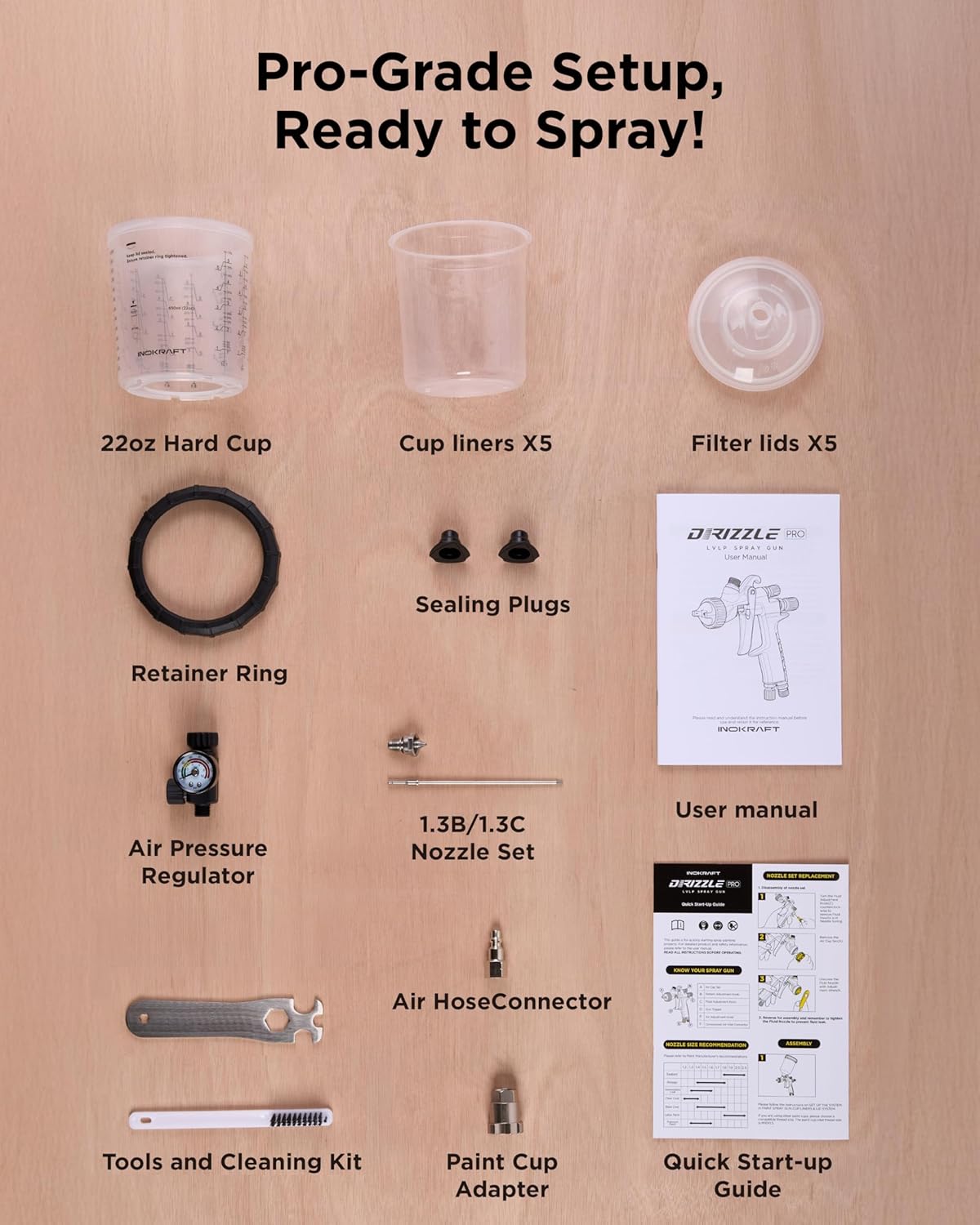 - Ready to Spray Out of the Box: Includes 1.3B & 1.3C nozzles for basecoat and clearcoat, pressure regulator, PPS adapter, and cleaning kit—no extra purchases needed. The finished product is manually adjusted and tested to ensure the ideal spraying effect.