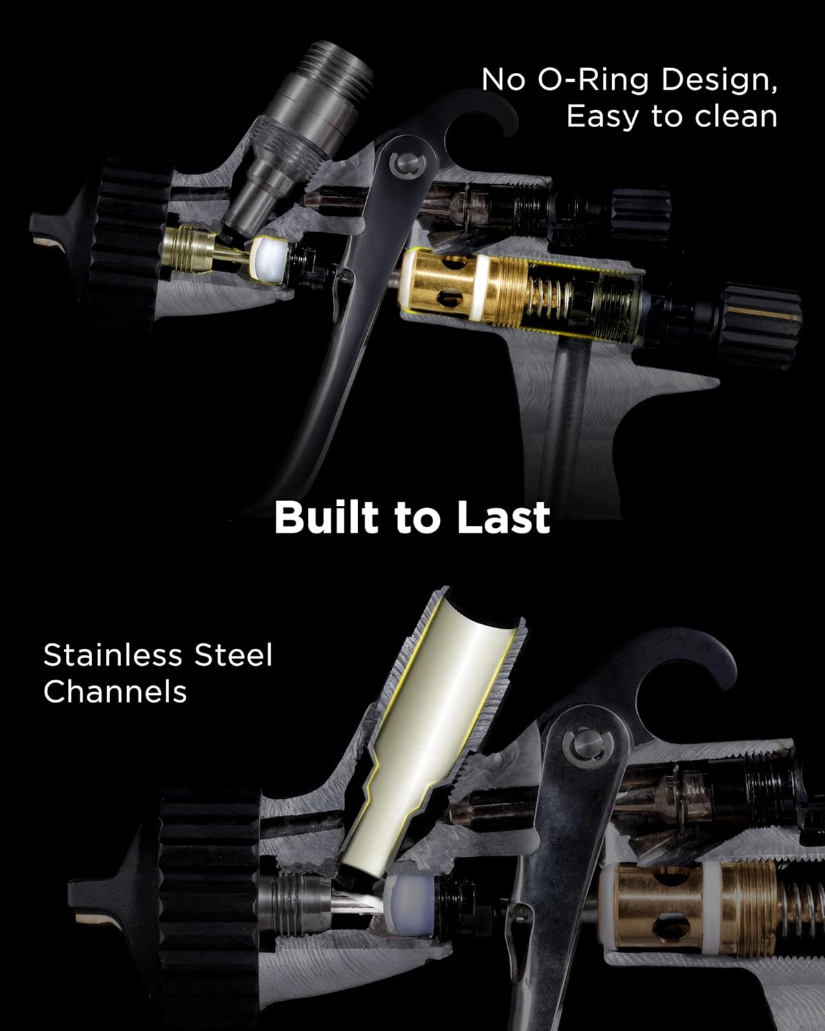 - Lightweight & Built to Last: Featherlight 340g Teflon body & ergonomic trigger reduces fatigue during marathon spray sessions. O-ring-free stainless steel fluid path resists corrosion and leaks—less maintenance, with more durability. The ultimate upgrade for PRO painters.