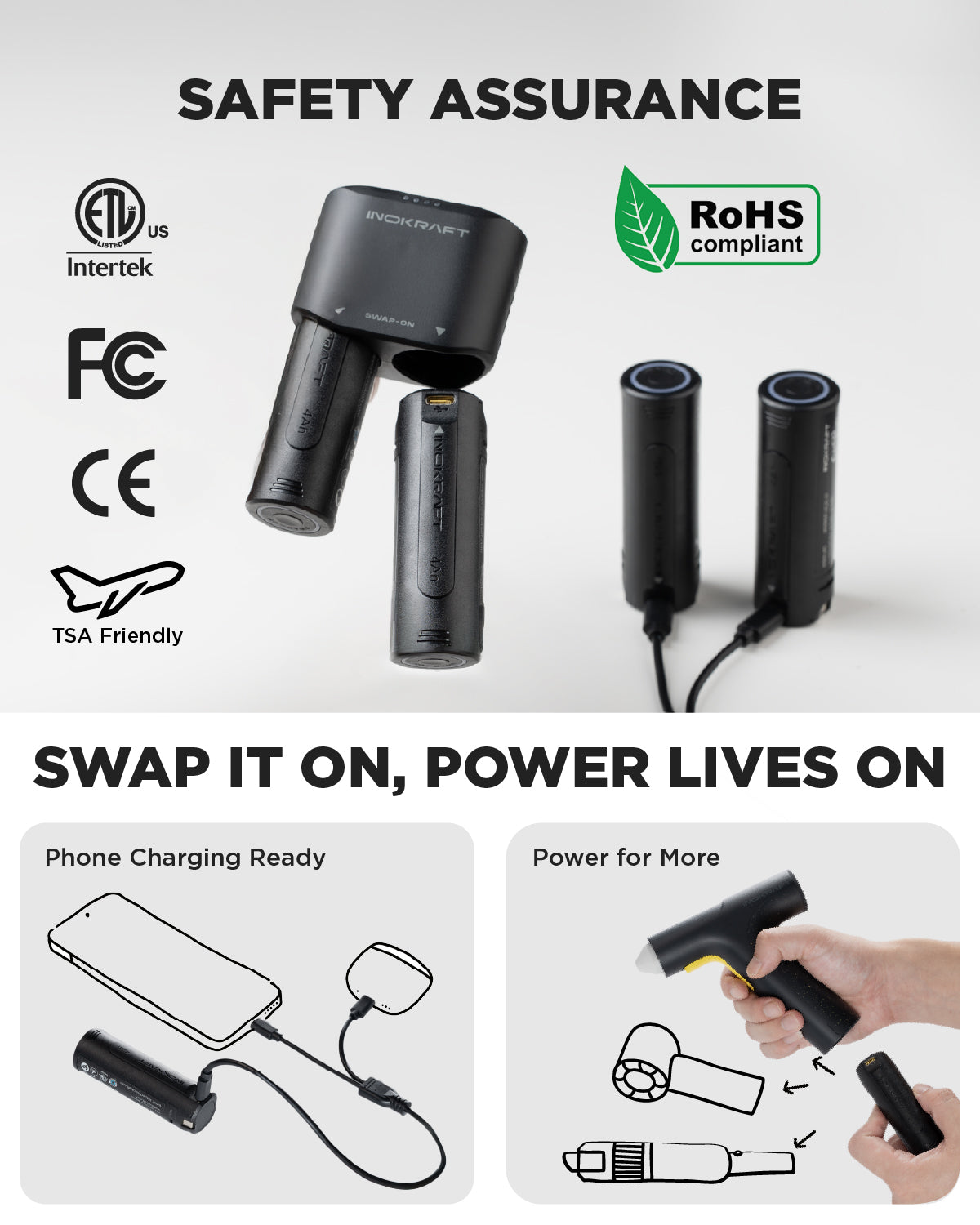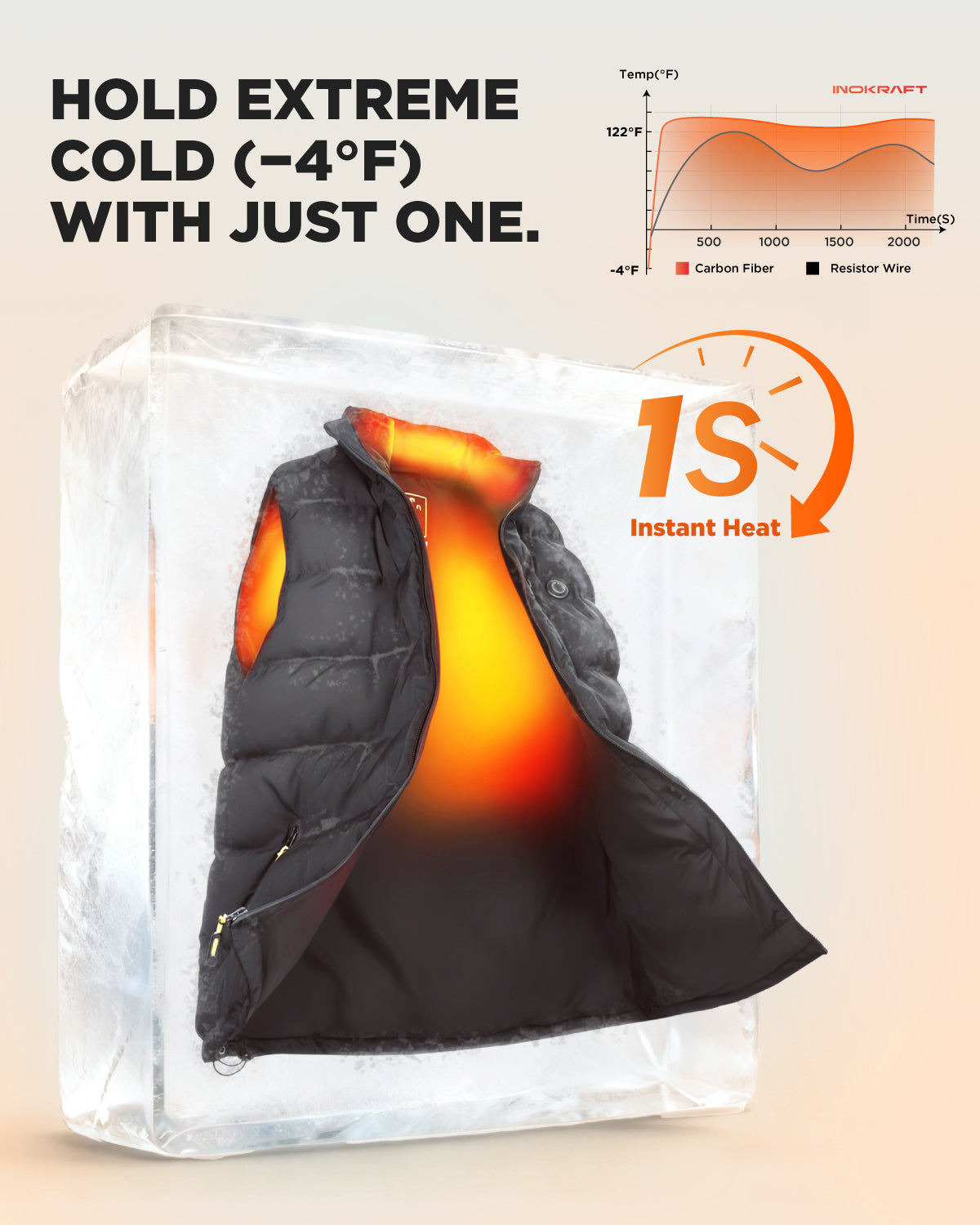 - All-Day Cozy Warmth: Powered by two swappable 4000mAh Li-ion cells, engineered for extreme cold and giving you extended runtime without limits. With a USB-C port(Charger Not Included), the battery doubles as a power bank for your phone, earbus, or other upcoming InoKraft devices.