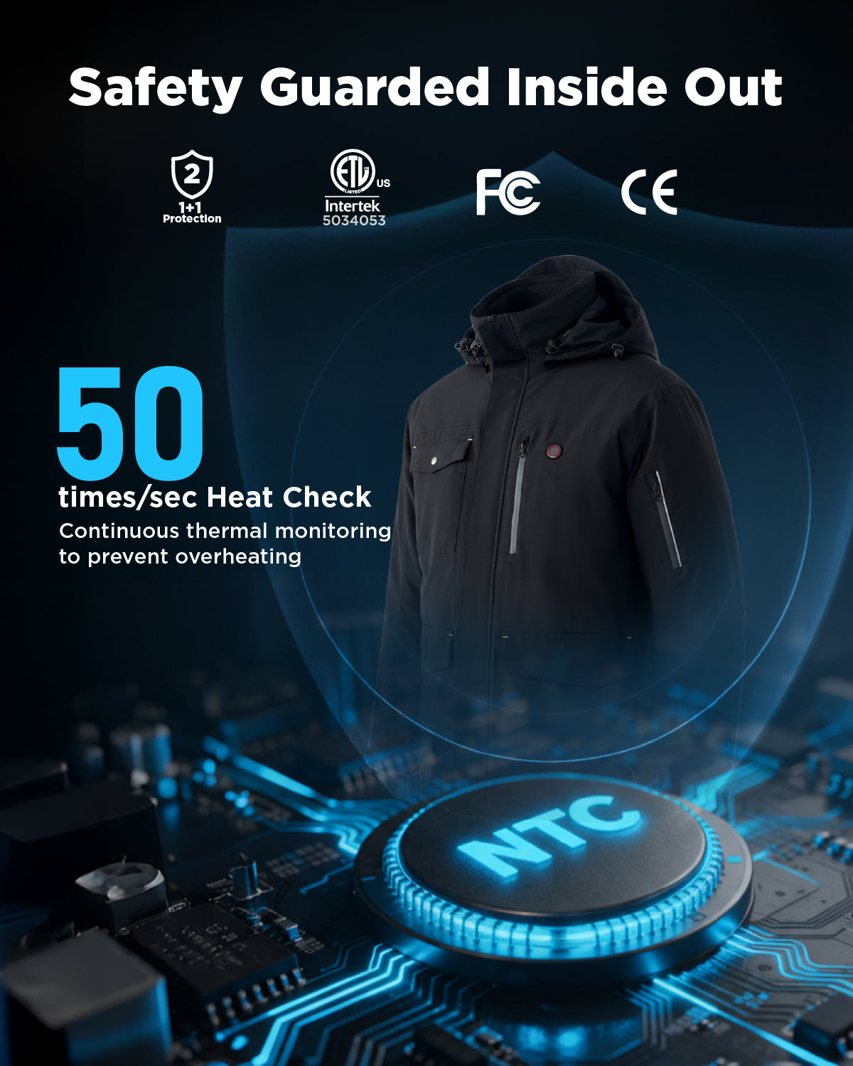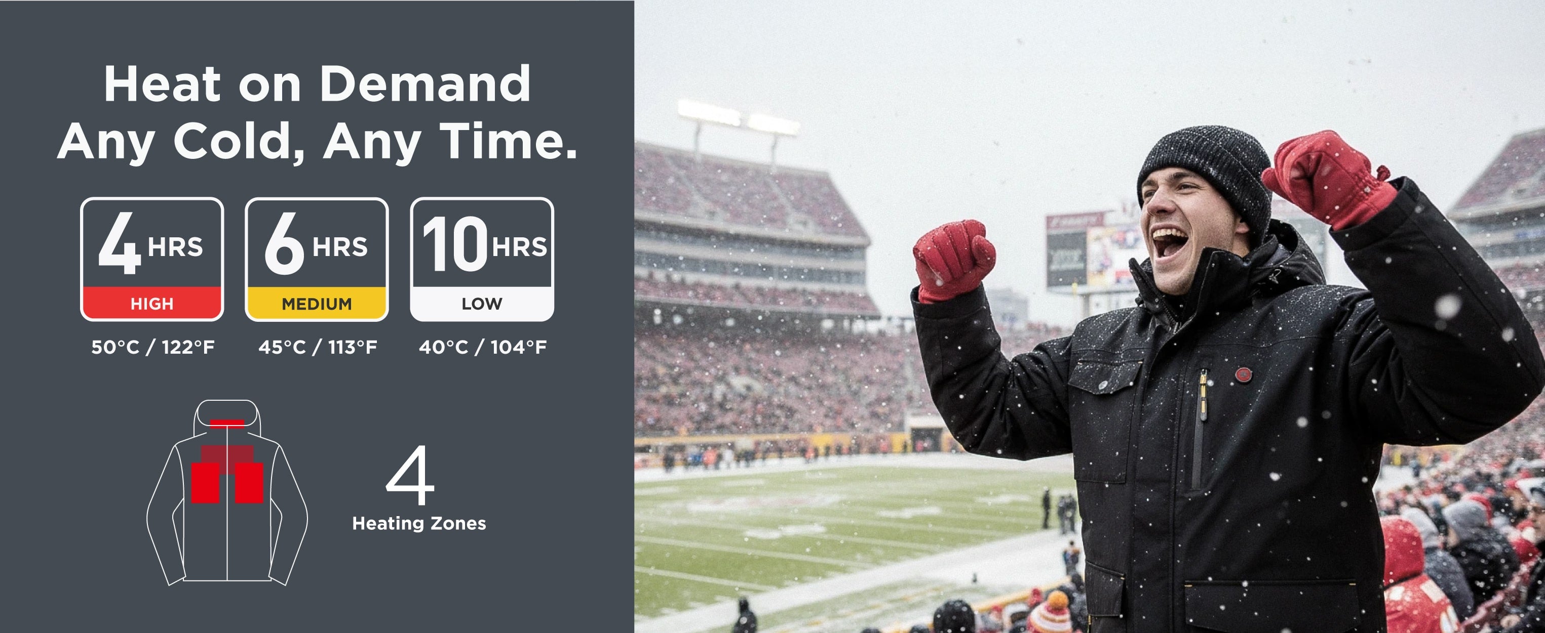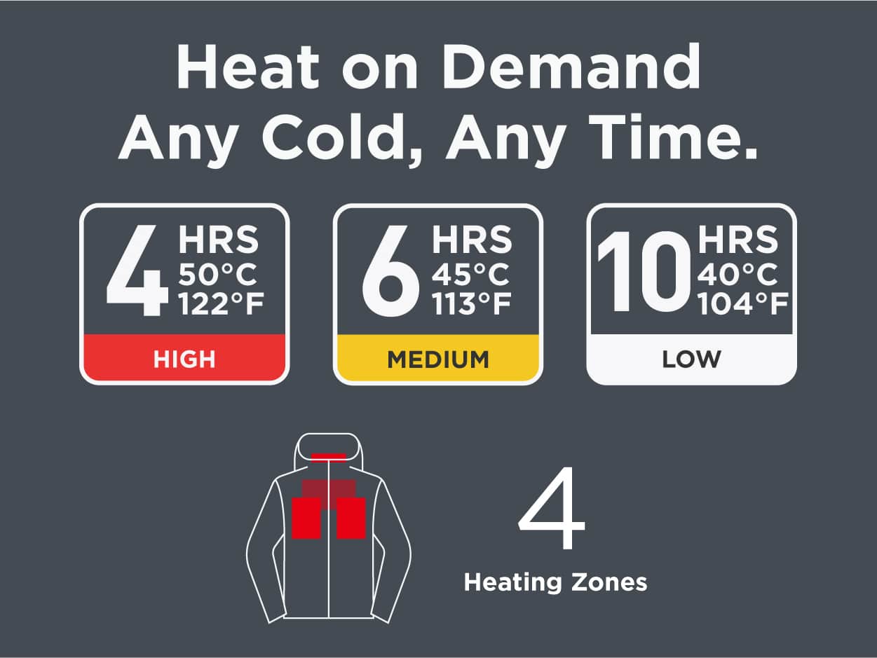 • Turbo Nano Heat, All-Day Comfort: Powered by patented carbon nano heating panels—the technology used only in industrial-grade gear—this heated jacket delivers rapid, evenly distributed warmth across a larger heating area. Runs up to 10 hours on a single charge. With one button, adjust 3 levels to match your comfort.