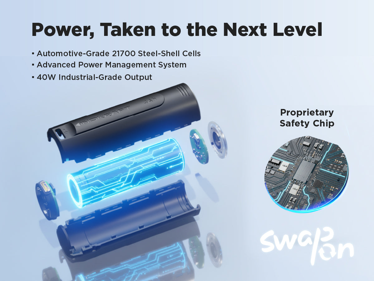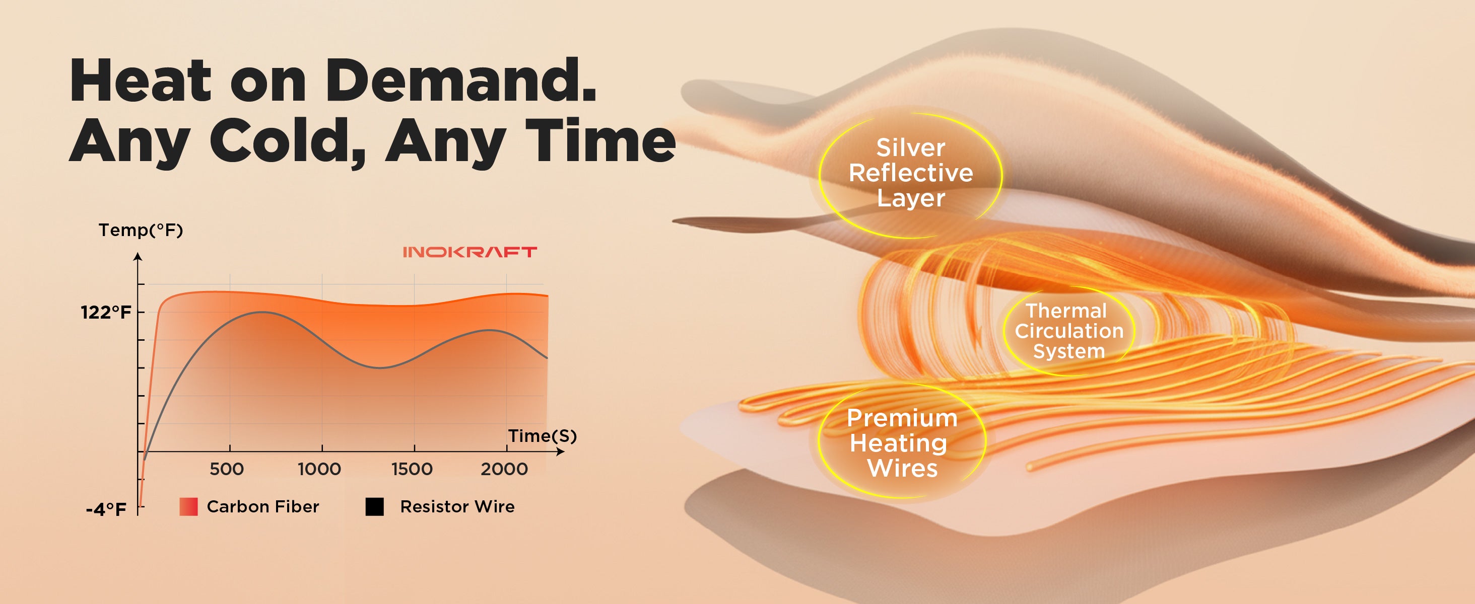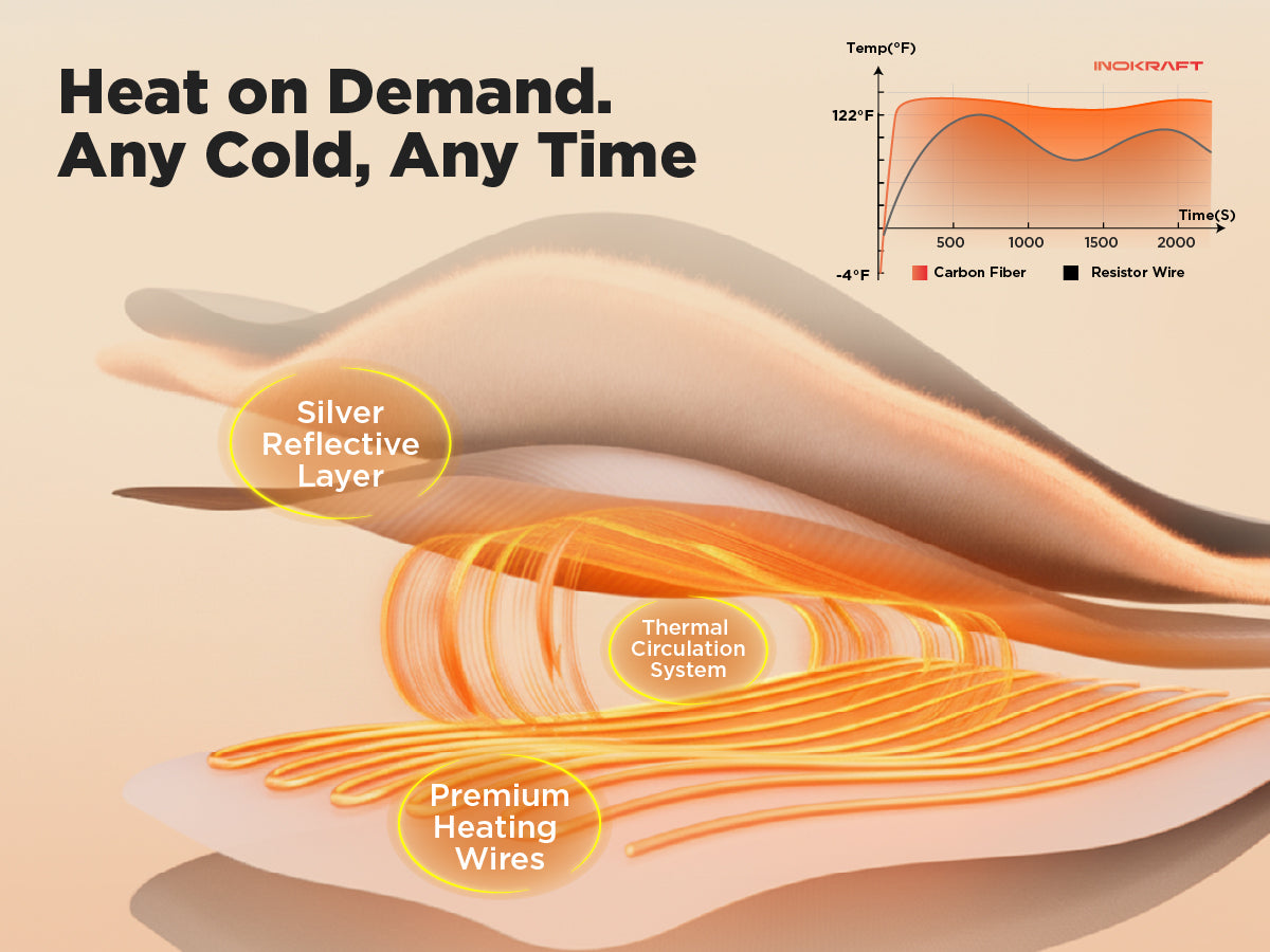 - All-Day Cozy Warmth: Powered by two swappable 4000mAh Li-ion cells, engineered for extreme cold and giving you extended runtime without limits. With a USB-C port(Charger Not Included), the battery doubles as a power bank for your phone, earbus, or other upcoming InoKraft devices.